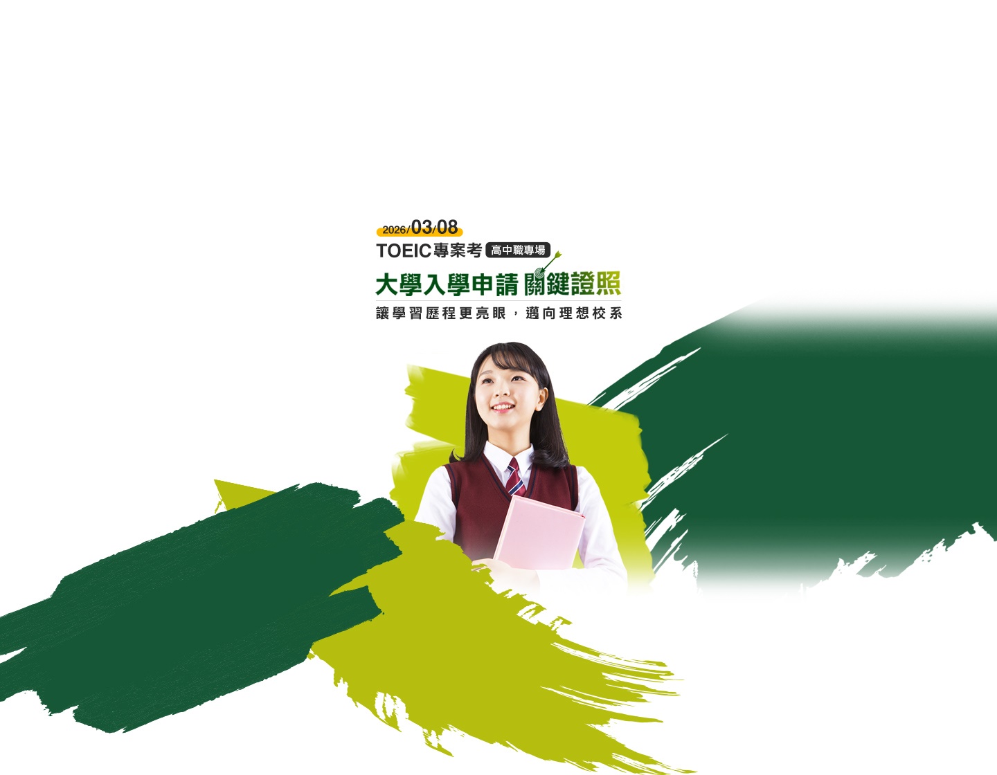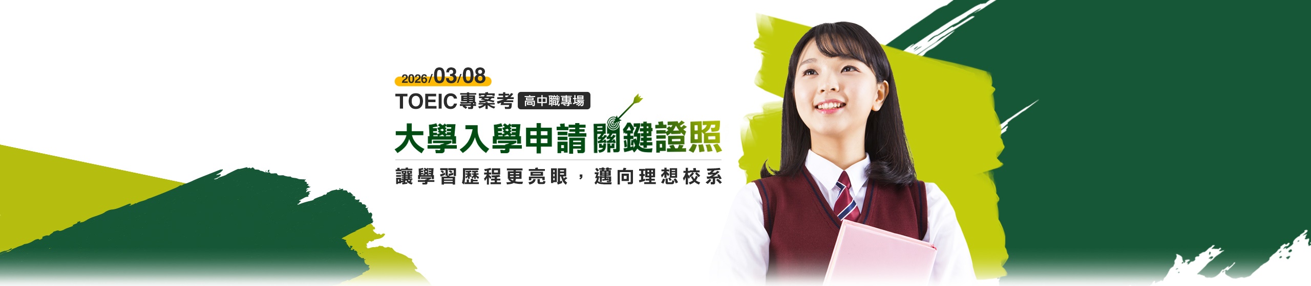 專案考 高中職專場】,讓高中職生及時取得TOEIC測驗成績,迎戰大學入學申請,前進心中理想校系!