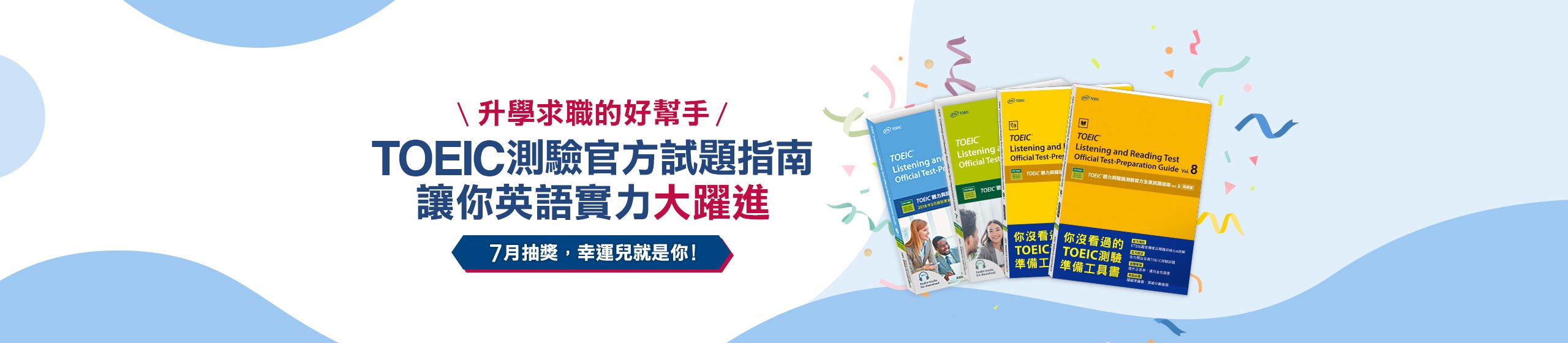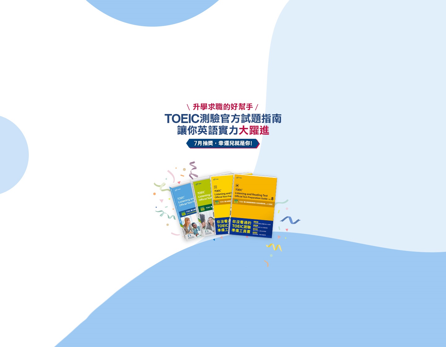 《TOEIC®聽力與閱讀測驗官方全真試題指南vol.6》抽出100名《TOEIC®聽力與閱讀測驗官方全真試題指南vol.7》抽出100名《TOEIC®聽力與閱讀測驗官方全真試題指南vol.8聽力篇》抽出25名《TOEIC®聽力與閱讀測驗官方全真試題指南vol.8閱讀篇》抽出25名 - 抽獎日期 : 2023 / 07/ 24 (一)