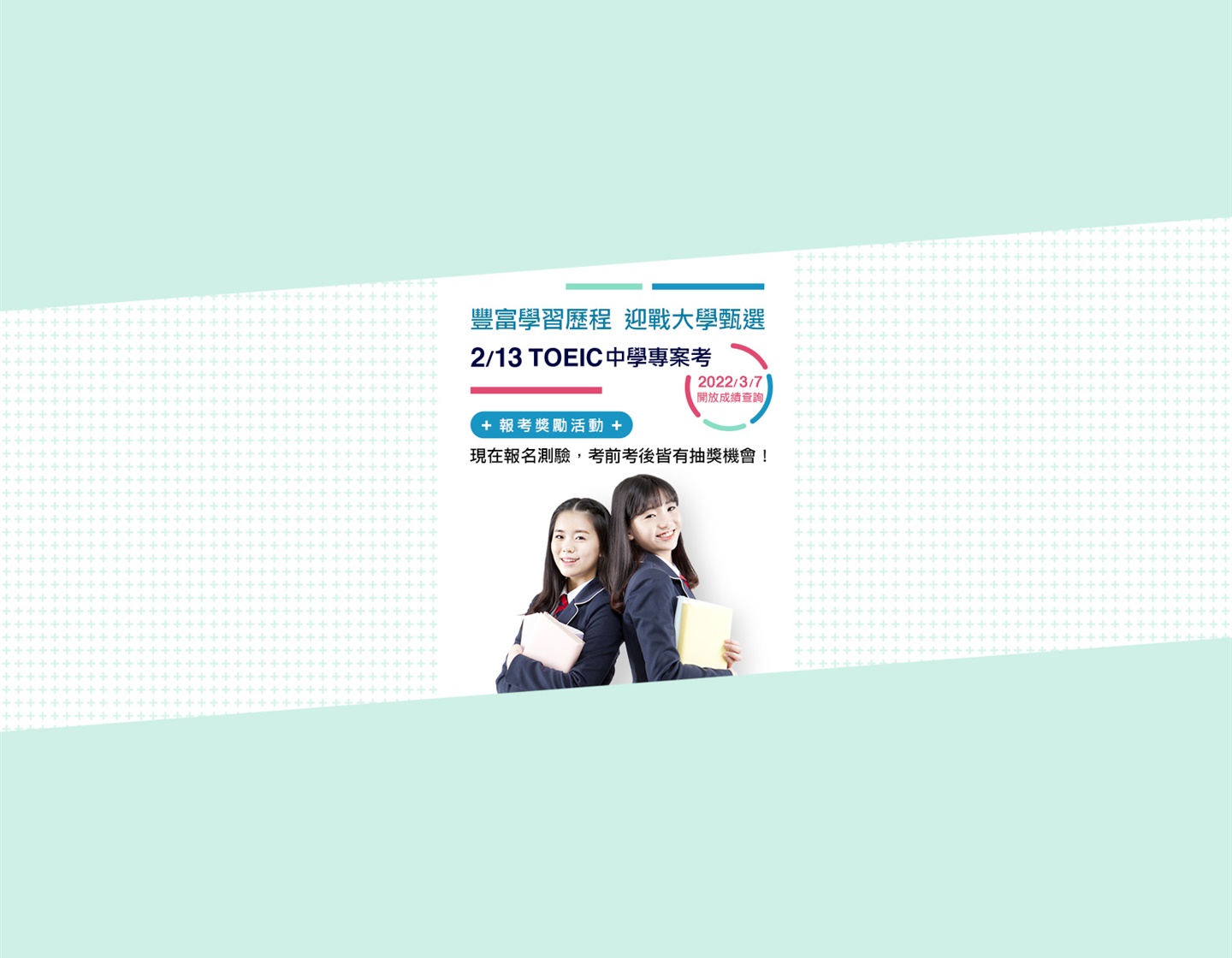 1.【2/13 TOEIC中學專案考】報名期間:2021/11/15~2022/1/4。
